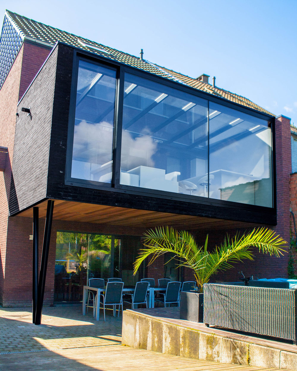 De woning is op een terrein gelegen dat aan de tuinzijde lager ligt dan aan de straatzijde. De leefruimte die op het gelijkvloers ligt vooraan, maar op de eerste verdieping achteraan, werd uitgebreid met een glazen volume dat ondersteund wordt door een V-vormige kolom. Het volume is volledig transparant gemaakt om de lichtinval in de achterliggende leefruimte zo weinig mogelijk te verhinderen.
