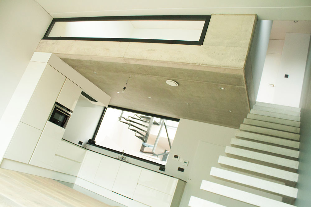 De leefruimte heeft een ruime plafondhoogte, waardoor ondanks de kleine afmetingen van de woning toch een grote ruimtelijkheid ontstaat. De slaapkamer bestaat uit een betonnen volume dat half in de leefruimte hangt en half boven het platte dak uitsteekt.