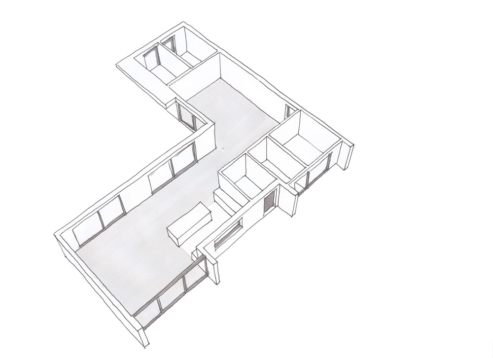 In het oorspronkelijke gedeelte werd de indeling in kleine ruimtes bijna volledig verwijderd. Zo ontstaat er een open leefruimte die een vervolg krijgt in het aangebouwde gedeelte. De Z-vormige leefruimte vormt de ruggengraat van de woning, de verschillende slaapkamers grenzen onmiddellijk aan de leefruimte.
